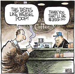 I And you just know there are plenty of people who would. Specialty coffees are very popular these days, attracting millions of consumers, every single one of whom is standing in line ahead of me whenever I go to the coffee place at the airport to grab a quick cup on my way to catch a plane. These consumers are always ordering mutant beverages with names like ``mocha-almond-honey-vinaigrette lattespressacino,'' beverages that must be made one at a time via a lengthy and complex process involving approximately one coffee bean, three quarts of dairy products and what appears to be a small nuclear reactor. Meanwhile, back in the line, there is growing impatience among those of us who just want a plain old cup of coffee so that our brains will start working and we can remember what our full names are and why we are catching an airplane. We want to strike the lattespressacino people with our carry-on baggage and scream ``GET OUT OF OUR WAY, YOU TREND GEEKS, AND LET US HAVE OUR COFFEE!'' But of course we couldn't do anything that active until we've had our coffee. It is inhumane, in my opinion, to force people who have a genuine medical need for coffee to wait in line behind people who apparently view it as some kind of recreational activity. I bet this kind of thing does not happen to heroin addicts. I bet that when serious heroin addicts go to purchase their heroin, they do not tolerate waiting in line while some dilettante in front of them orders a hazelnut smack-a-cino with cinnamon sprinkles. The reason some of us need coffee is that it contains caffeine, which makes us alert. Of course it is very important to remember that caffeine is a drug, and, like any drug, it is a lot of fun. No! Wait! What I meant to say is: Like any drug, caffeine can have serious side effects if we ingest too much. This fact was first noticed in ancient Egypt when a group of workers, who were supposed to be making a birdbath, began drinking Egyptian coffee, which is very strong, and wound up constructing the pyramids. I myself developed the coffee habit in my early 20s, when, as a ``cub'' reporter for the Daily Local News in West Chester, Pa., I had to stay awake while writing phenomenally boring stories about municipal government. I got my coffee from a vending machine that also sold hot chocolate and chicken-noodle soup; all three liquids squirted out of a single tube, and they tasted pretty much the same. But I came to need that coffee, and even today I can do nothing useful before I've had several cups. (I can't do anything useful afterward, either; that's why I'm a columnist.) But here's my point: This specialty-coffee craze has gone too far. I say this in light of a letter I got recently from alert reader Bo Bishop. He sent me an invitation he received from a local company to a ``private tasting of the highly prized Luwak coffee,'' which ``at $300 a pound . . . is one of the most expensive drinks in the world.'' The invitation states that this coffee is named for the luwak, a ``member of the weasel family'' that lives on the Island of Java and eats coffee berries; as the berries pass through the luwak, a ``natural fermentation'' takes place, and the berry seeds -- the coffee beans -- come out of the luwak intact. The beans are then gathered, washed, roasted and sold to coffee connoisseurs. The invitation states: ``We wish to pass along this once in a lifetime opportunity to taste such a rarity.'' Or, as Bo Bishop put it: ``They're selling processed weasel doodoo for $300 a pound.'' I first thought this was a clever hoax designed to ridicule the coffee craze. Tragically, it is not. There really is a Luwak coffee. I know because I bought some from a specialty-coffee company in Atlanta. I paid $37.50 for two ounces of beans. I was expecting the beans to look exotic, considering where they'd been, but they looked like regular coffee beans. In fact, for a moment I was afraid that they were just regular beans, and that I was being ripped off. Then I thought: What kind of world is this when you worry that people might be ripping you off by selling you coffee that was NOT pooped out by a weasel? So anyway, I ground the beans up and brewed the coffee and drank some. You know how sometimes, when you're really skeptical about something, but then you finally try it, you discover that it's really good, way better than you would have thought possible? This is not the case with Luwak coffee. Luwak coffee, in my opinion, tastes like somebody washed a dead cat in it. But I predict it's going to be popular anyway, because it's expensive. One of these days, the people in front of me at the airport coffee place are going to be ordering decaf poopacino. I'm thinking of switching to heroin. |